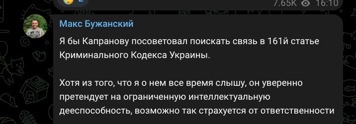"Я бы Капранову посоветовал поискать связь в 161-й статье Уголовного кодекса Украины (статья касается нарушения равноправия граждан в зависимости от их расовой, национальной, региональной принадлежности - Ред.). Хотя из того, что я о нем все время слышу, он уверенно претендует на ограниченную интеллектуальную дееспособность, возможно, так страхуется от ответственности", - написал в своем телеграм-канале народный депутат Максим Бужанский.