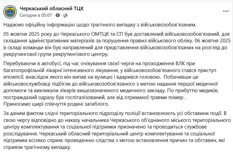 В Черкассах мужчина скончался во время прохождения медкомиссии в территориальном центре комплектации и социальной поддержки.