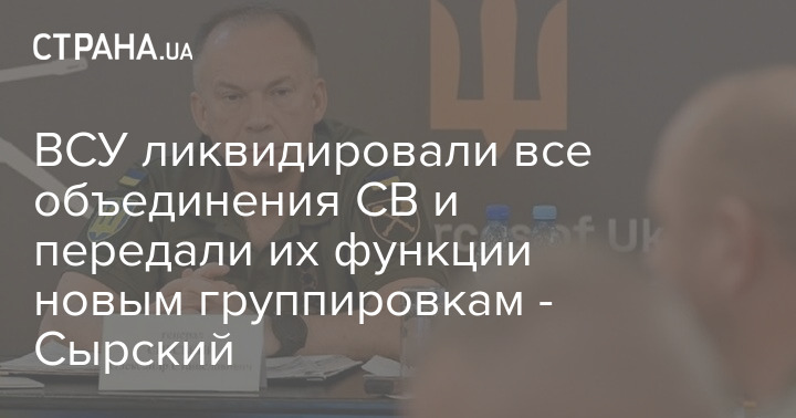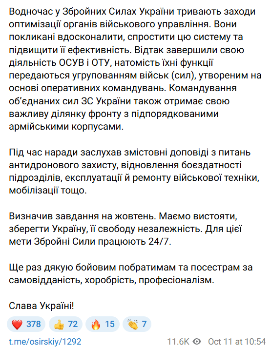 "Завершили свою деятельность ОСУВ и ОТУ, их функции передаются группировкой войск (сил), образованной на основе оперативных командований. Командование объединенных сил ВС Украины получит свой важный участок фронта с подчиненными армейскими корпусами", - пишет Сырский.