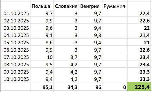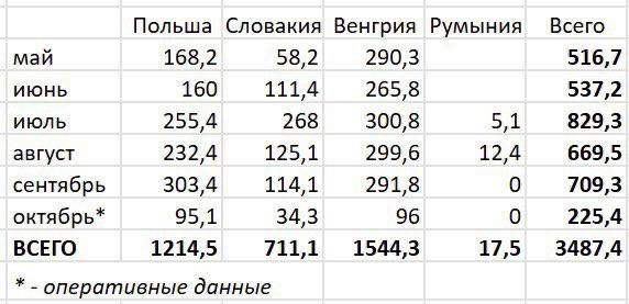 Если за август-сентябрь в Украину поступило 670-710 миллионов кубометров, то в первой декаде октября импорт составил 225 миллионов кубометров, то есть месячный показатель составит 695-710 миллионов кубометров.