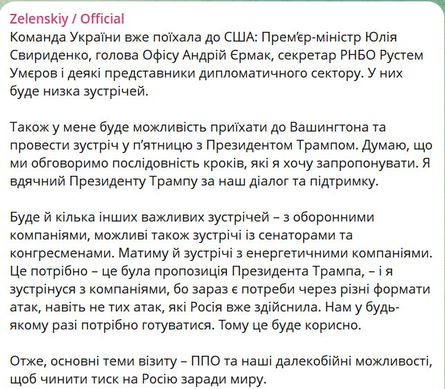 По словам президента, в США направились премьер-министр Юлия Свириденко, глава Офиса президента Андрей Ермак, секретарь СНБО Рустем Умеров и некоторые представители дипломатического сектора.