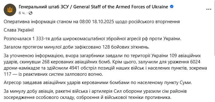 "Вчера захватчики нанесли по территории Украины 109 авиационных ударов, сбросив 268 управляемых авиационных бомб. Кроме того, привлекли для поражения 6024 дрона-камикадзе и произвели 4941 обстрел позиций наших войск и населенных пунктов, в том числе 117 — из реактивных систем залпового огня", - говорится в сообщении.