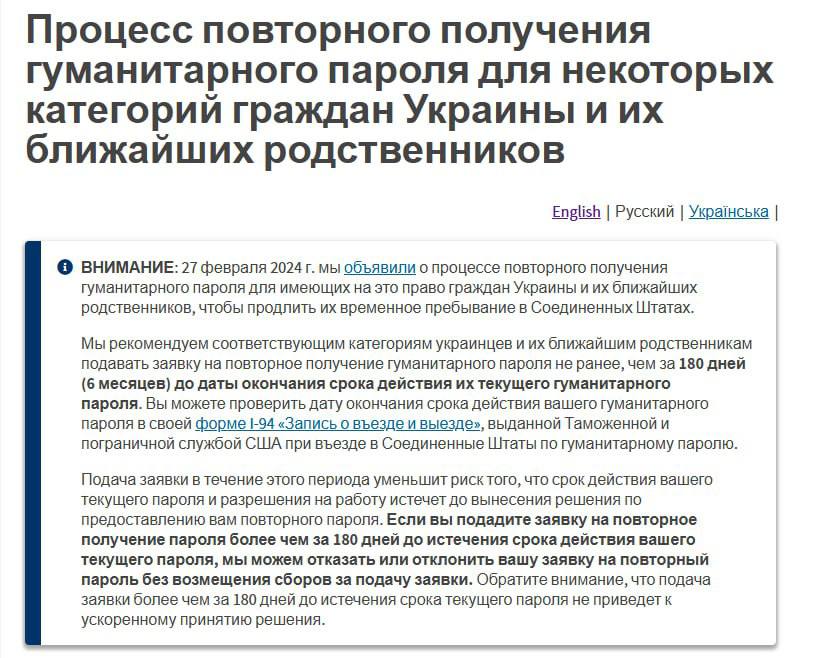 Для продления parole, которые заканчиваются позже, власти США рекомендуют подавать заявку не ранее, чем за 180 дней до окончания текущего parole.
