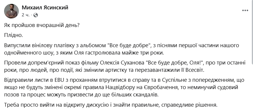 Канал "Суспильне" отказал артистке в изменении правил, заявив, что это невозможно сделать после начала отборочного конкурса. Тогда, как сообщил Ясинский, команда певицы обратилась в Европейский вещательный союз. По его словам, в письмах к организации команда Поляковой указала, что если "Суспильне" не изменит правила нацотбора, то "неизбежный судебный иск и процесс могут привести к еще большим скандалам".