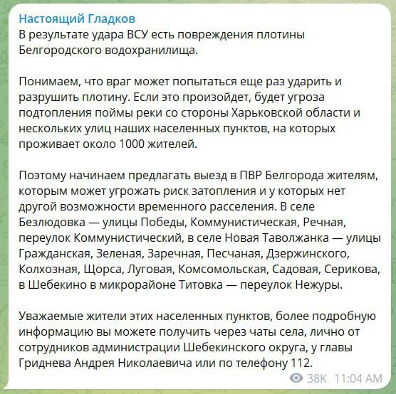 Удар по плотине подтвердил и губернатор Белгородской области Вячеслав Гладков.