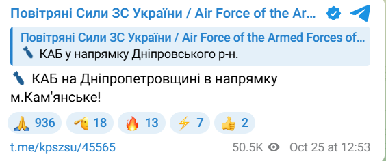 "КАБ на Днепропетровщине в направлении г.Каменское", - сообщили в Воздушных силах.