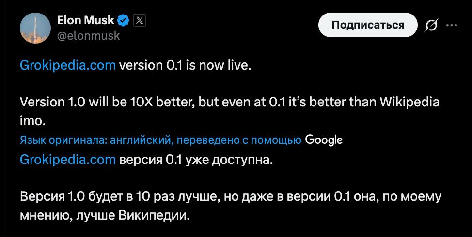 "Версия "Грокипедии" 0.1 уже доступна. Версия 1.0 будет в 10 раз лучше, но даже в версии 0.1 она, по моему мнению, лучше "Википедии", - похвалился Маск.