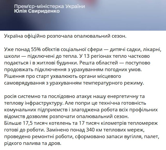 "Более 17,5 тысячи котельных и 17 тысяч километров теплосетей готовы к работе. Заменены более 340 км тепловых сетей, проведены ремонтные работы, сформированы запасы угля, паллет, жидкого топлива и дров", - пишет Свириденко.