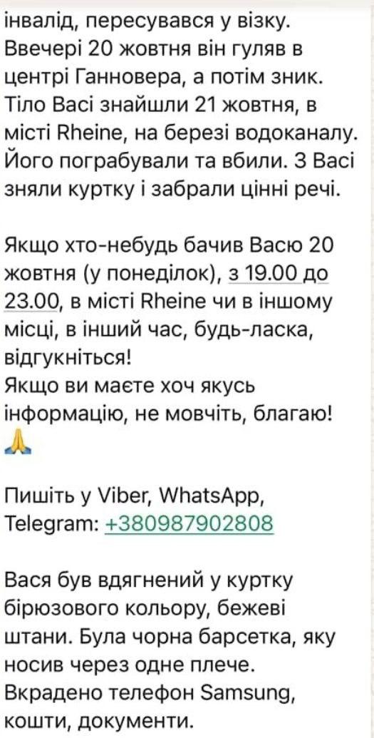 В немецком Ганновере пропал молодой гражданин Украины по имени Василий, который передвигался на инвалидной коляске. Его нашли убитым в другом городе.