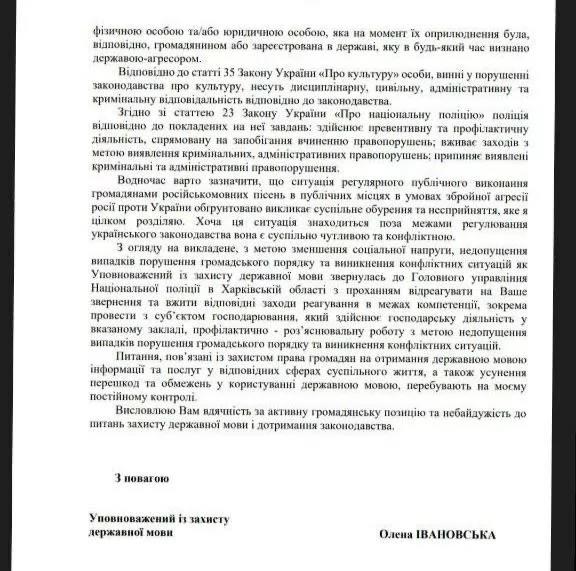 "В то же время следует отметить, что ситуация регулярного публичного исполнения гражданами русскоязычных песен в публичных местах в условиях вооруженной агрессии России против Украины обоснованно вызывает общественное возмущение и неприятие, которое я полностью разделяю. Хотя эта ситуация находится вне регулирования украинского законодательства, она общественно чувствительна и конфликтна", - написала Ивановская и призвала полицию вмешаться.