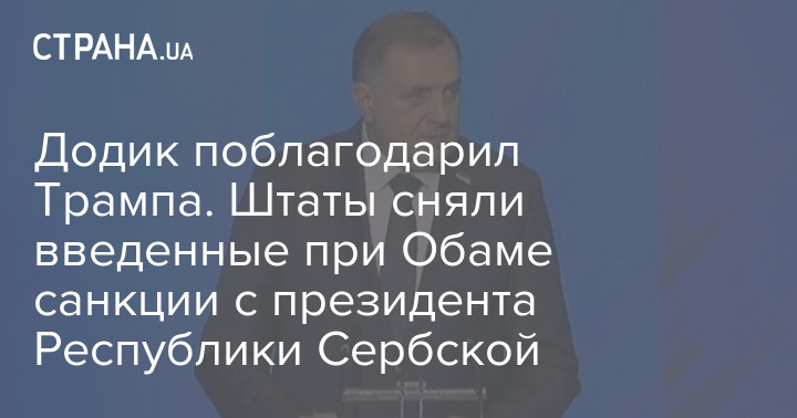 Вашингтон снял санкции с президента Республики Сербской Милорада Додика, которые против него ввели во времена президентства Барака Обамы. Додик в ответ поблагодарил действующего президента США Дональда Трампа.