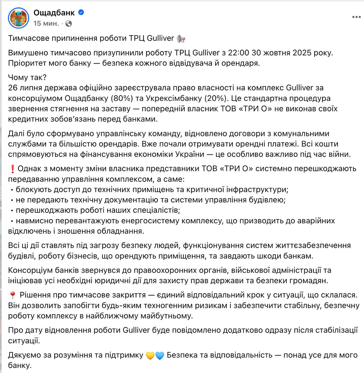 Позже Ощадбанк официально подтвердил закрытие ТРЦ Gulliver из-за корпоративного конфликта, подчеркнув временный характер мер, но не указав сроки открытия.