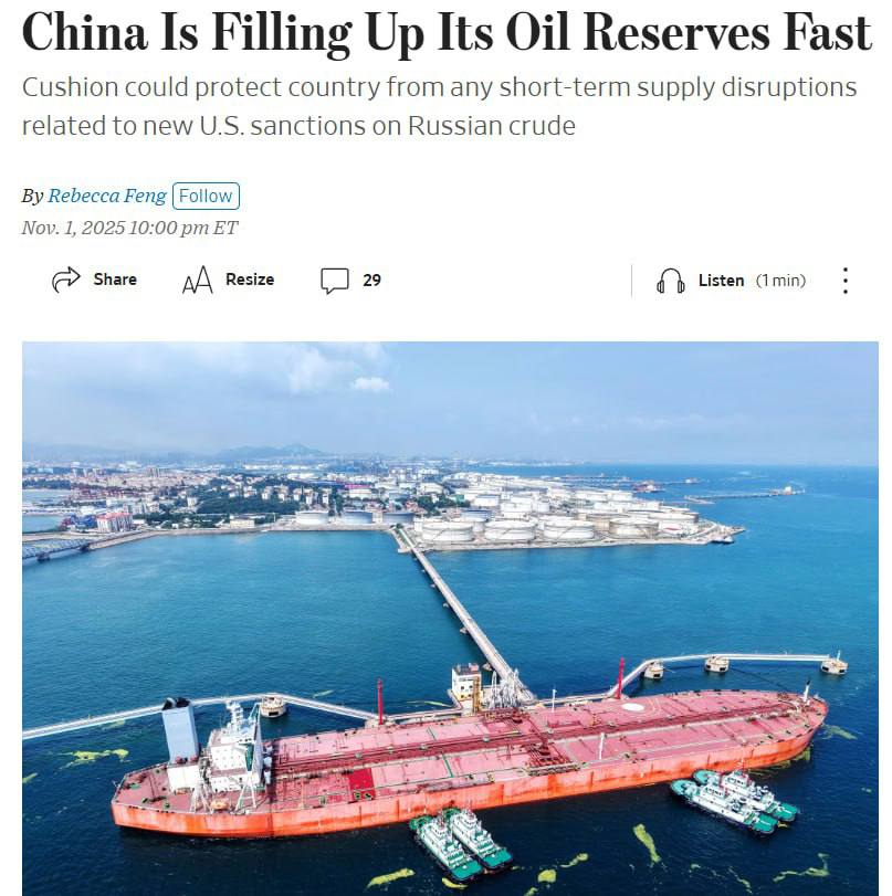 По мнению экспертов, не смотря на то что накопление запасов продолжится до конца года, скорее всего китайские НПЗ не сократят закупки российской нефти из-за санкций против "Роснефти" и "Лукойла", которые не позволяют им проводить операции в долларах.