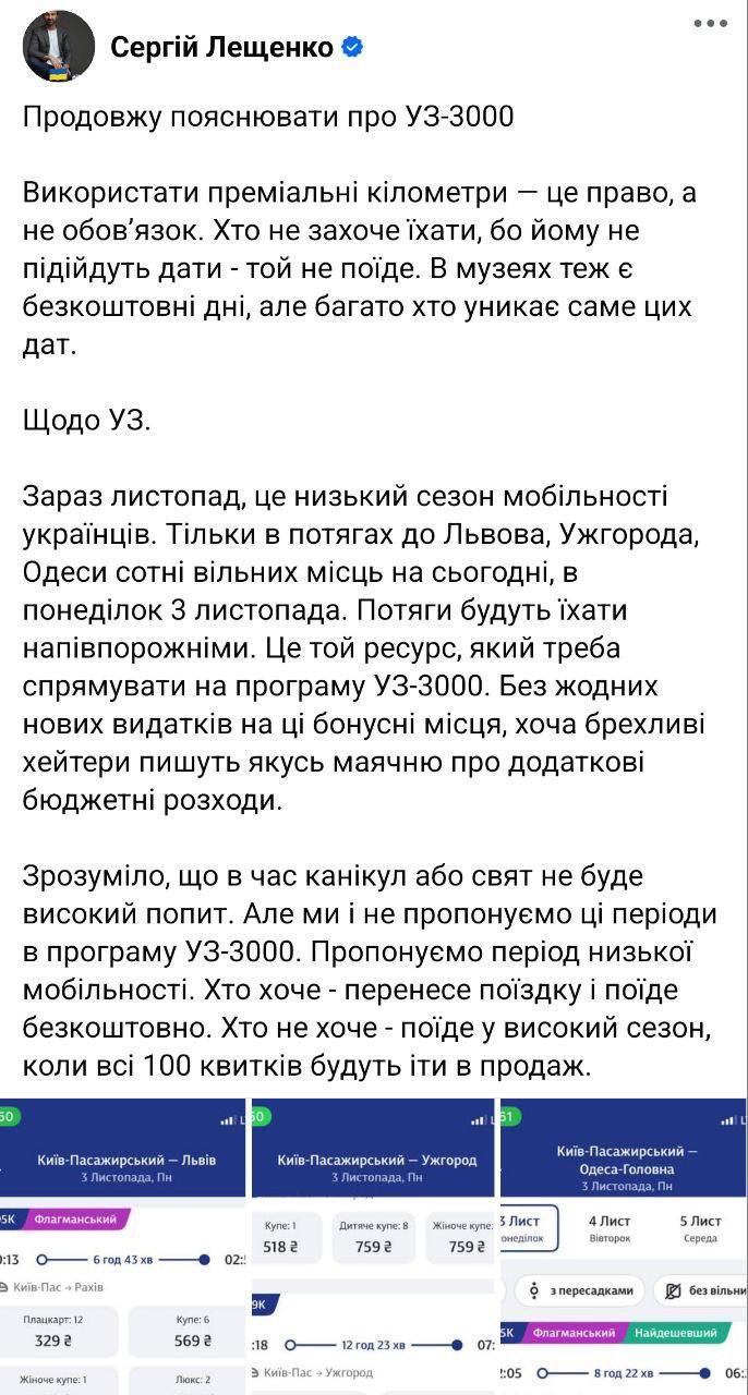 "Сейчас ноябрь, это низкий сезон мобильности украинцев. Только в поездах во Львов, Ужгород, Одессу сотни свободных мест на сегодня. Поезда будут ехать полупустыми. Это тот ресурс, который нужно направить на программу "У3-3000". Без всяких новых расходов на эти бонусные места. Понятно, что во время каникул или праздников будет высокий спрос. Но мы и не предлагаем эти периоды. Предлагаем период низкой мобильности", - объяснил Лещенко.