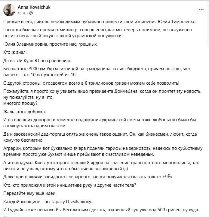 Пожалуйста, я просто хочу увидеть лицо президента Дойчебана, когда он прочтет эту новость, ну пожалуйста, ну я что, многого прошу? Жаль этого добряка. И на внешних доноров в моменте подписания украинской сметы тоже любопытно было бы взглянуть хоть одним глазком. Аграрии, которым вот буквально вчера подняли тарифы на зерновозы, надеюсь, по субботнему времени просто уже бухают и ещё пребывают в счастливом неведеньи. Кто, кто приложил к этой инициативе руку и другие части тела? Передайте ему ещё идеи: каждой женщине - по Тарасу Цымбалюку. И Гудвайн тоже неплохо бы бесплатным сделать, тыквенный суп уже под 500 гривен, ну куда", - пишет Анна Ковальчук и подытоживает: "живем не просто не в сказке, а в х@йне какой-то".