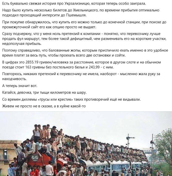 "Бесплатные 3000 км Укрзализницей на гражданина за счет бюджета, причем не факт, что нашего - это 10 потужностей из 10. С другой стороны, с госдолгом всего в 8 триллионов гривен можем себе позволить!