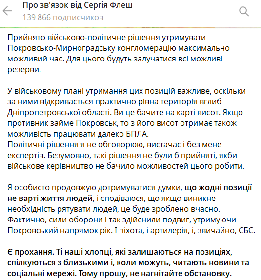 "Принято военно-политическое решение удерживать Покровско-Мирноградскую конгломерацию максимально возможное время. Для этого будут привлекаться все возможные резервы. В военном плане удержание этих позиций важно, поскольку за ними открывается практически ровная территория в глубь Днепропетровской области. Если противник займет Покровск, то с его высот получит возможность далеко работать БпЛА. Я лично продолжаю придерживаться мнения, что никакие позиции не стоят жизни людей, и надеюсь, что, если возникнет необходимость спасать людей, это будет сделано вовремя", - заявил Бескрестнов.