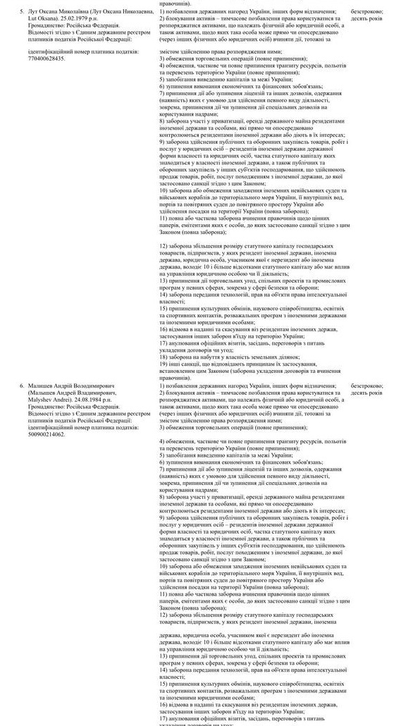Кроме того, под санкции попали министр сельского хозяйства России Оксана Луи, первый заместитель министра просвещения РФ Александр Бугаев, замминистра культуры Андрей Малышев и замминистра образования и науки РФ Андрей Омельчук.