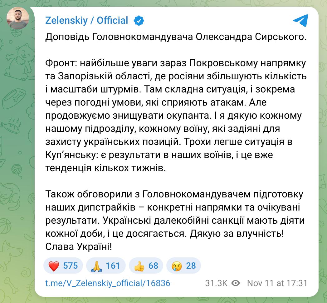 - в Покровске и Запорожской области "сложная ситуация", в частности, из-за погодных условий, которые способствуют атакам россиян (судя по видео с фронта - там сейчас сильный туман, что препятствует ударам дронов - Ред.) Россияне увеличивают количество и масштабы штурмов;