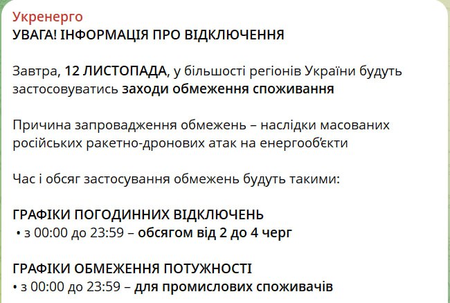 "Укрэнерго" сообщает, что вместо анонсированных вчера вечером 2-3,5 очередей, отключать будут 2-4.
