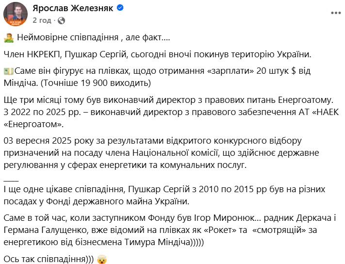"И ещё одно интересное совпадение: Пушкарь Сергей с 2010 по 2015 годы занимал разные должности в Фонде государственного имущества Украины. Именно в то время, когда заместителем Фонда был Игорь Миронюк… советник Деркача и Германа Галущенко, уже известный по плёнкам как Рокет и смотрящий за энергетикой от бизнесмена Тимура Миндича. Вот так совпадение", - добавил нардеп.