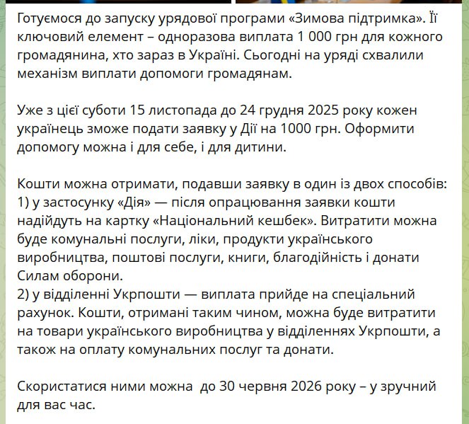 Премьер-министр Юлия Свириденко также заявила, что подать заявку на единоразовую выплату тысячи гривен в рамках правительственной "зимней поддержки" можно будет с 15 ноября по 24 декабря.