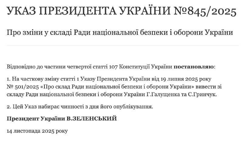 "В соответствии с частью четвертой статьи 107 Конституции Украины постановляю: в рамках частичного изменения статьи 1 указа президента Украины от 19 июля 2025 г. № 501/2025 "О составе Совета национальной безопасности и обороны Украины" вывести из состава Совета национальной безопасности и обороны Украины Г.Галущенко и С.Гринчук", - сказано в докеументе.