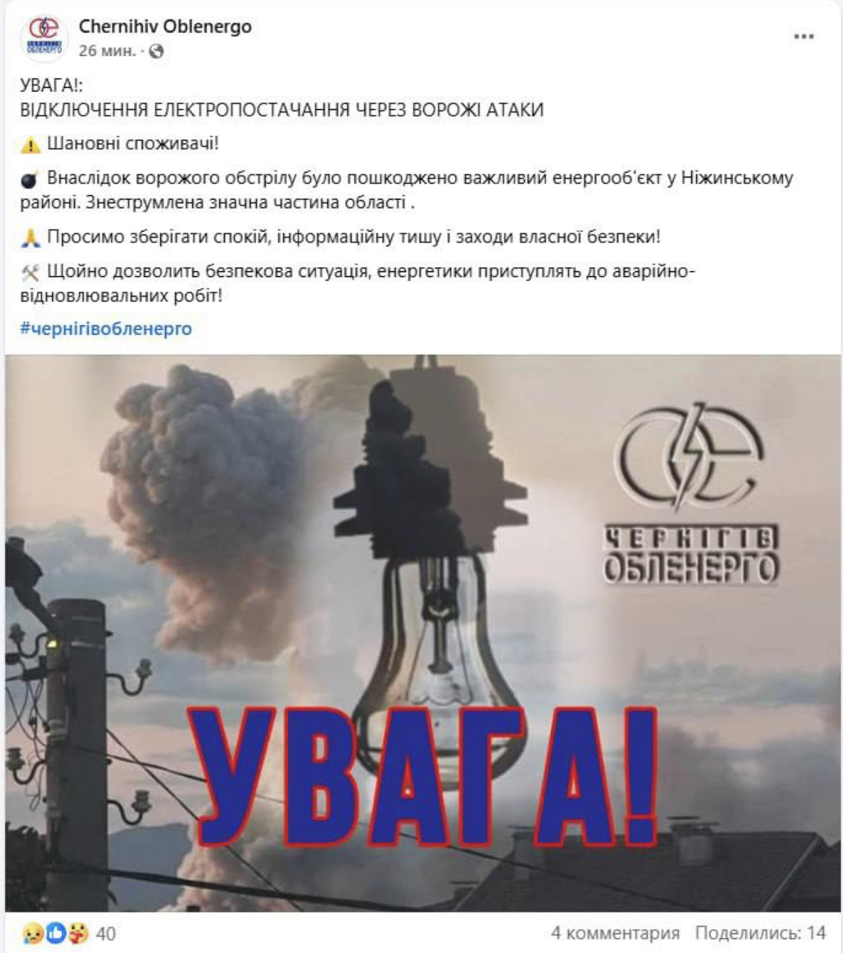 14:14 Из-за ударов по энергетике обесточена значительная часть Черниговской области, поврежден важный энергообъект в Нежинском районе, сообщает облэнерго.