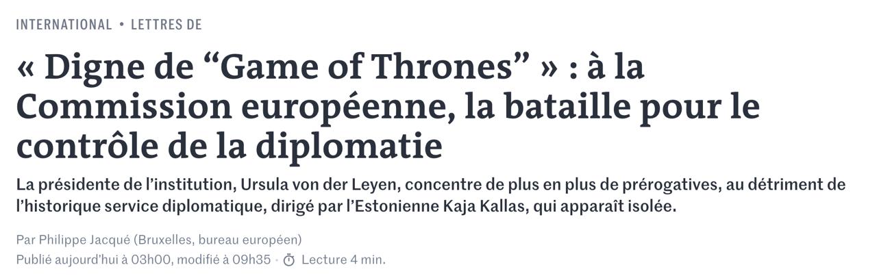 Каллас не удается проводить свою политику, различные генеральные директораты, отвечающие за внешние связи, действуют автономно или по распоряжению аппарата фон дер Ляйен. Глава евродипломатии заранее не заручилась поддержкой европейских столиц и никто не приходит ей на помощь.