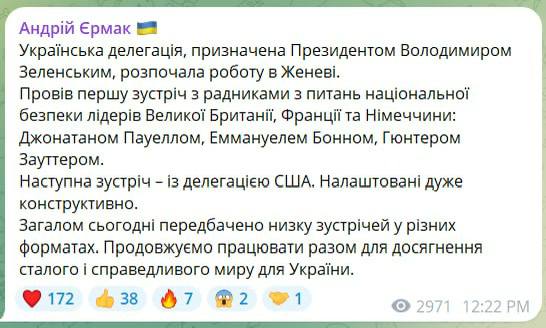 "Провел первую встречу с советниками по национальной безопасности лидеров Великобритании, Франции и Германии: Джонатаном Пауэллом, Эммануэлем Бонном, Гюнтером Зауттером.