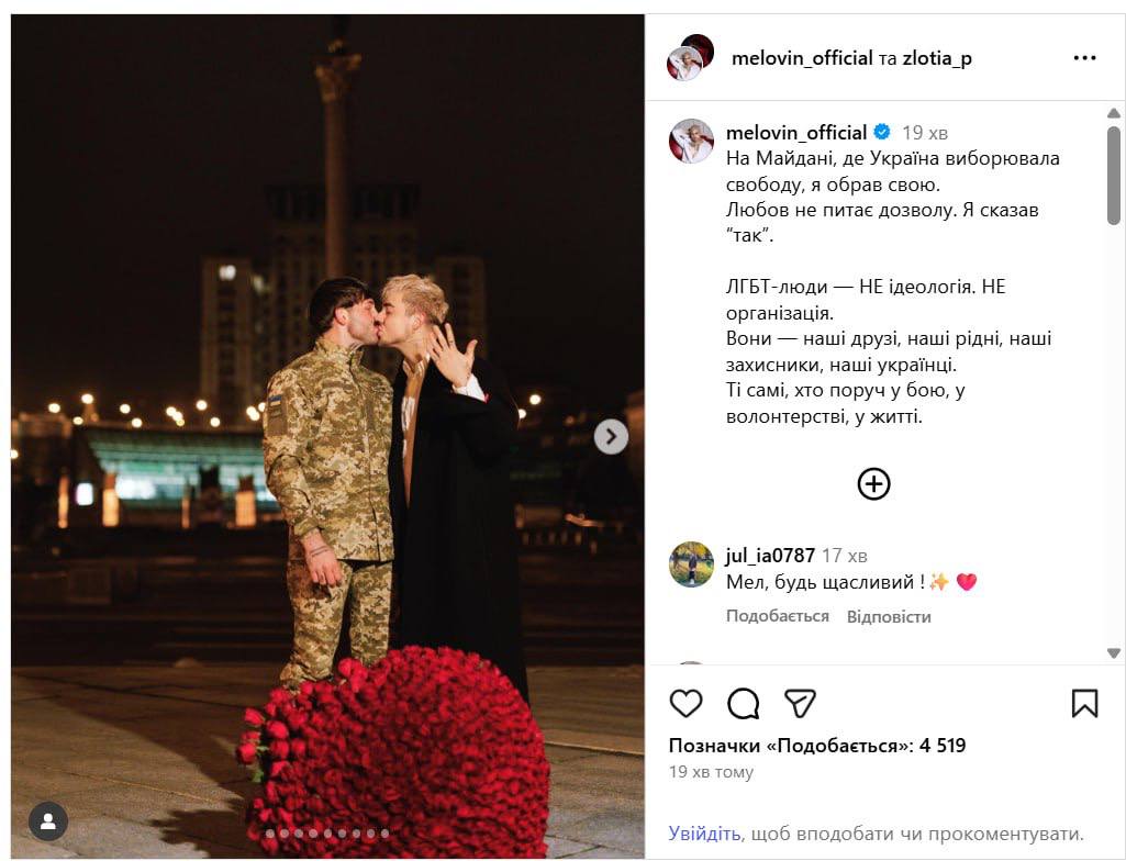 "На Майдане, где Украина выбрала свободу, я выбрал свою. Любовь не спрашивает разрешения. Я сказал "Да". ЛГБТ-люди - не идеология, они наши друзья, наши родные, наши защитники, наши украинцы", - написал Melovin.
