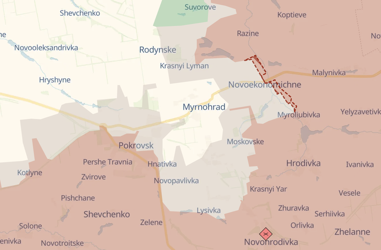 По его словам, россияне продвинулись также в восточной части Мирнограда (что фиксировал и Deep State), пытаясь одновременно проломить оборону и по линии высоток, и с флангов.