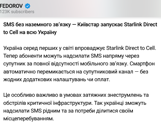 "В Украине, где блэкауты и повреждения инфраструктуры стали частью реальности, оставаться на связи означает оставаться в безопасности. В критические моменты важно каждое сообщение - оно может быть на вес жизни. Во внедрении технологии Starlink Direct to Cell мы начинаем с базового, но жизненно необходимого функционала - обмена SMS", - заявил SEO компании "Киевстар" Александр Комаров.