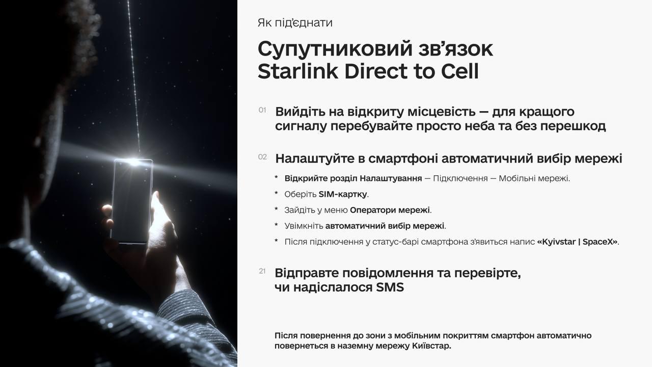 Для подключения услуги Starlink Direct to Cell необходимо выйти на открытое пространство и настроить в смартфоне автоматический выбор сети, после чего устройство автоматически подключится к спутниковой сети "Kyivstar-SpaceX".