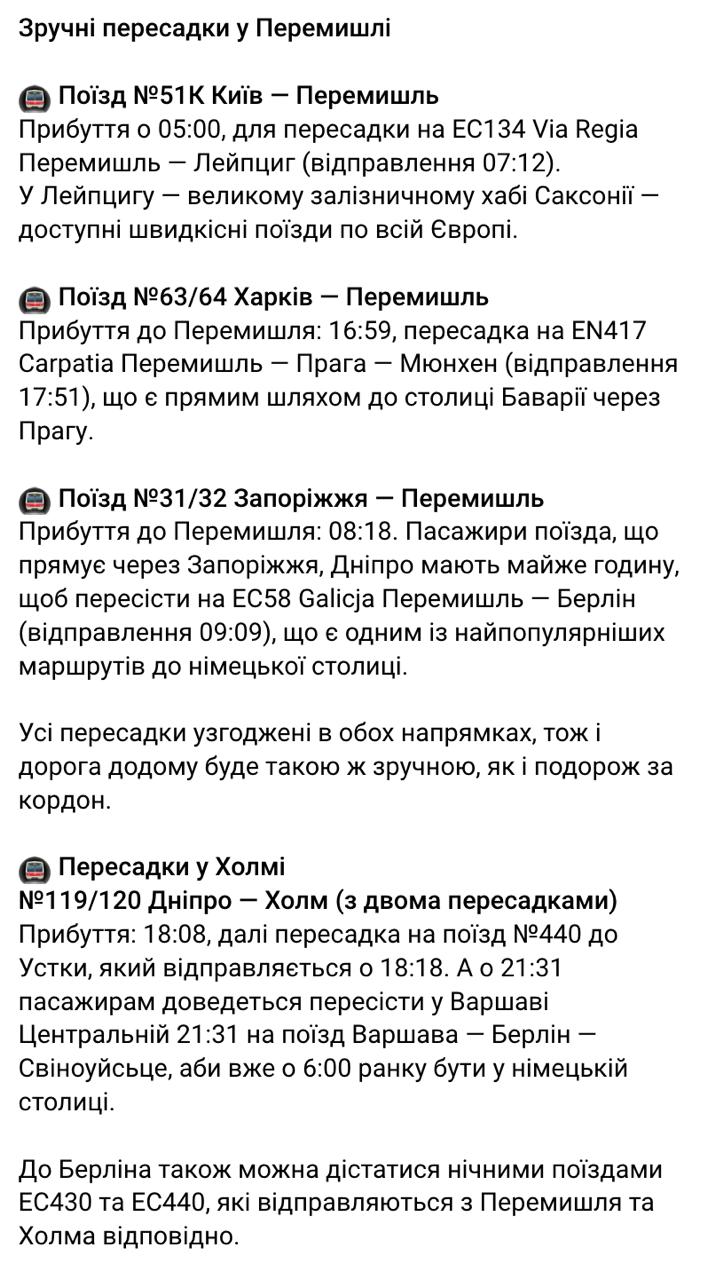 - Поезд №31/32 Запорожье — Перемышль. Прибытие в Перемышль: 08:18. Пассажиры, следующие через Запорожье и Днепр, имеют почти час, чтобы пересесть на EC58 Galicja Перемышль — Берлин (отправление в 09:09) — один из самых популярных маршрутов в столицу Германии.