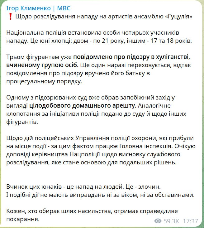 По делу о нападении на ивано-франковский национальный ансамбль песни и пляски "Гуцулия" во Львовской области начались задержания.