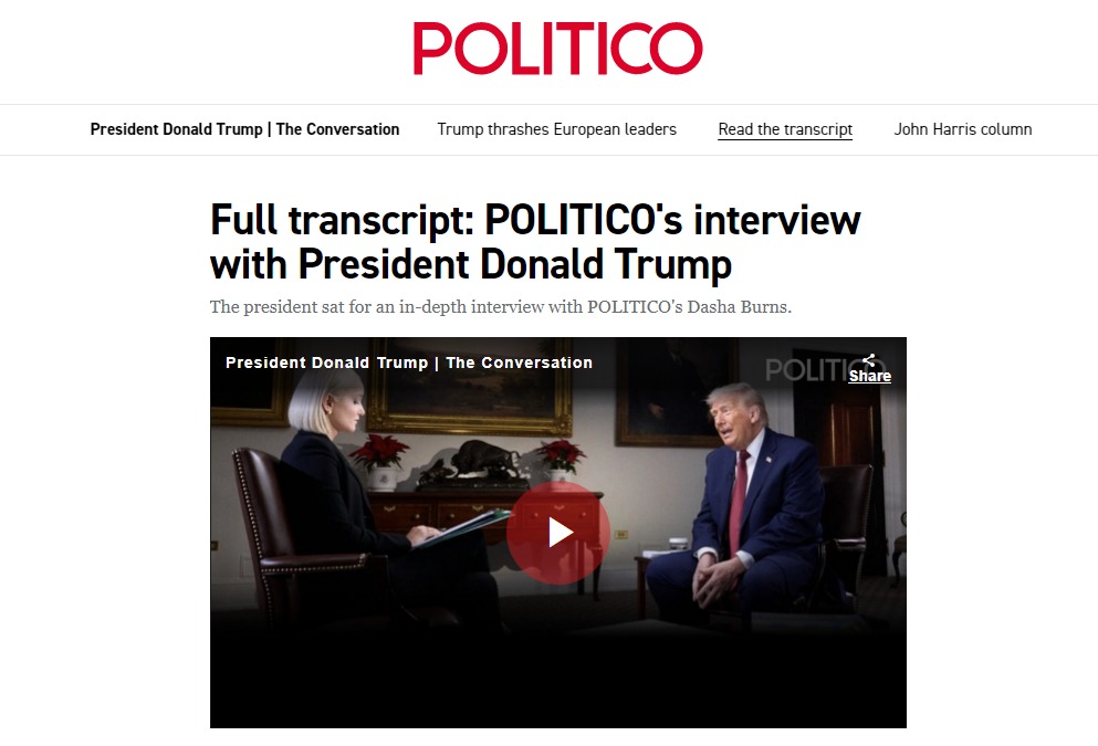 Президент США Дональд Трамп дал большое интервью журналистке издания Politico Даше Бернс, значительная часть которого была посвящена Украине.