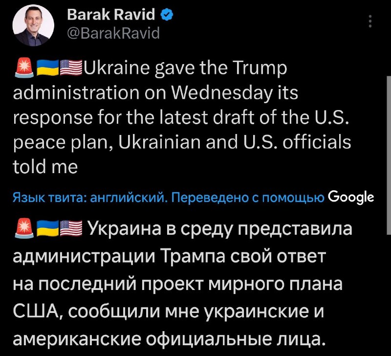"Украину в среду представила администрации президента США Дональда Трампа свой ответ на последний проект мирного плана США", - говорится в сообщении Равида.