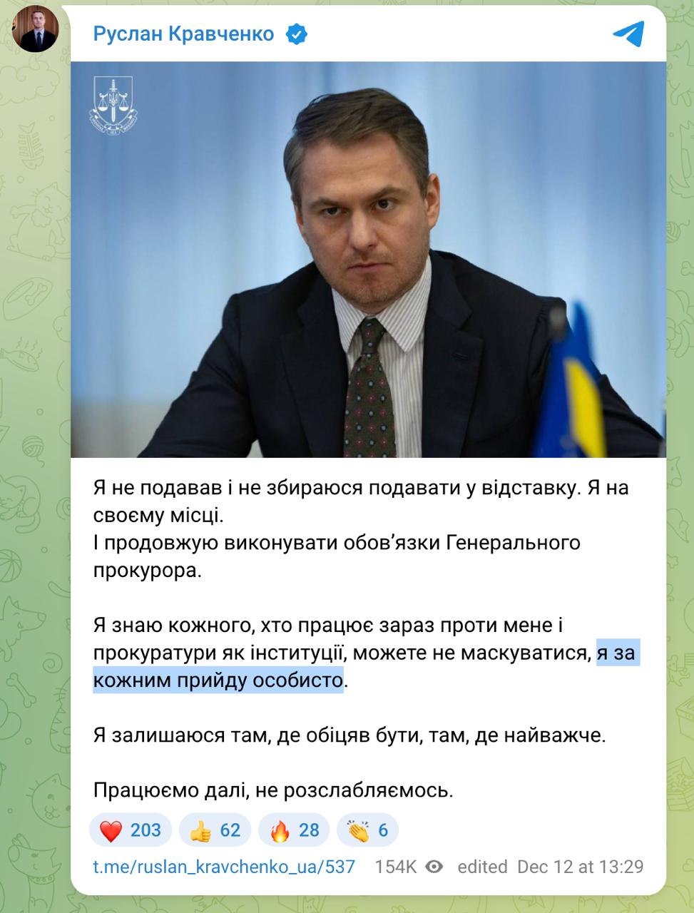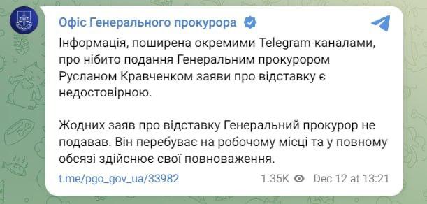 "Информация, распространенная отдельными Telegram-каналами о якобы подаче генеральным прокурором Русланом Кравченко заявления об отставке, является недостоверной. Никаких заявлений об отставке генеральный прокурор не подавал. Он находится на рабочем месте и в полном объеме осуществляет свои полномочия", - говорится в сообщении.