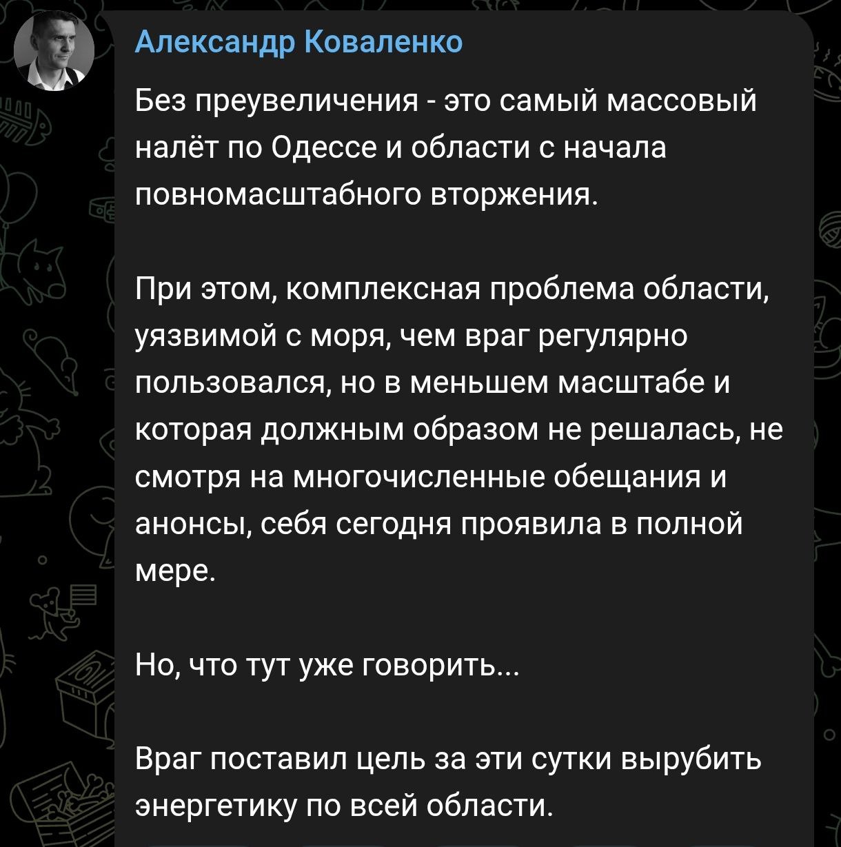 Напомним, по данным местных пабликов, прилёты были по десятку подстанций и одной ТЭС в Одесской области.