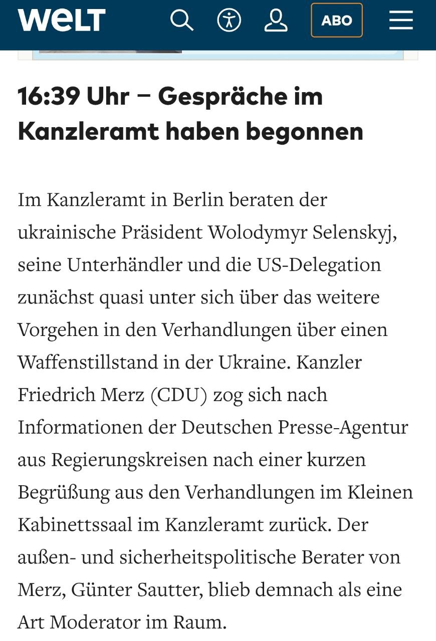 18:22 Мерц покинул переговоры Зеленского и Уиткоффа в Берлине, пишет Die Welt.