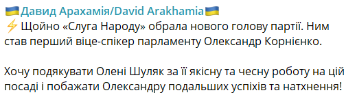 "Только что "Слуга народа" избрала нового главу партии. Им стал первый вице-спикер парламента Александр Корниенко", - написал Арахамия.