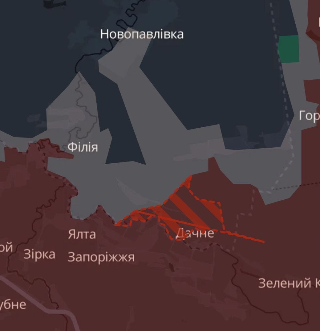 Также вчера россияне продвинулись к югу от Запорожья: серая зона вплотную подошла к селу Лукьяновскому под Степногорском, где за последние дни было продвижение войск РФ.