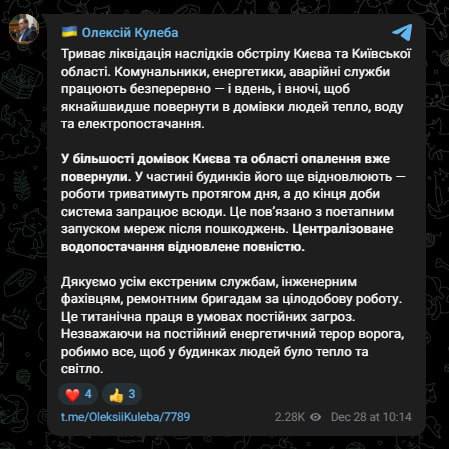 11:58 В Киеве и в области до конца дня уже должны вернуть отопление всем жителям, обещает вице-премьер Кулеба.