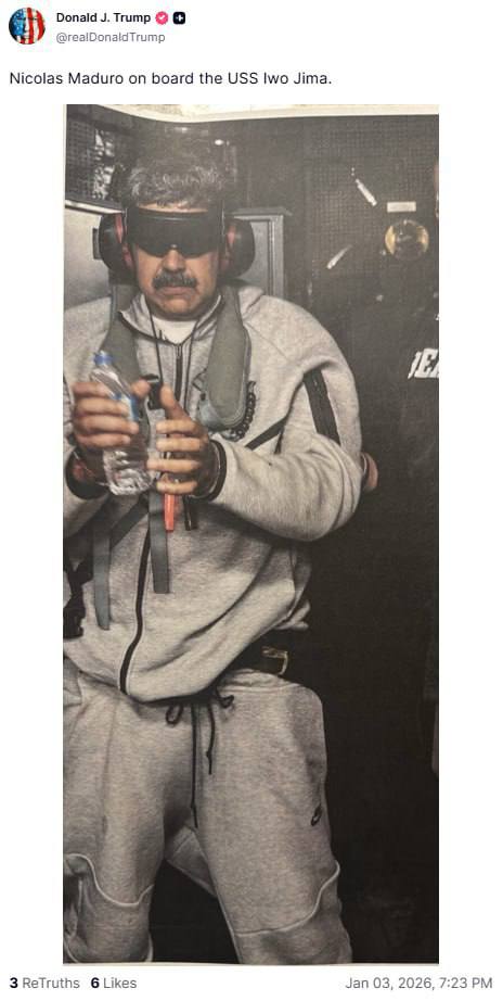 12:41 Пишут, что это первое фото задержанного американцами президента Венесуэлы Мадуро.