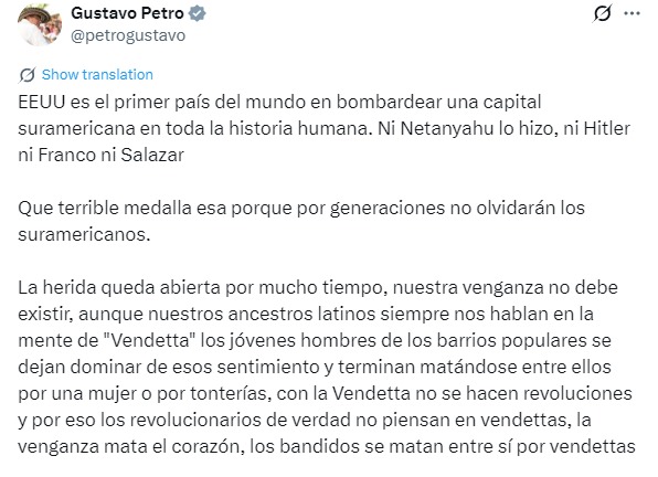 "США - первая страна в мире, которая бомбила столицу Южной Америки за всю историю человечества. Даже Нетаньяху, Гитлер, Франко или Салазар этого не делали. Какая ужасная разница, ведь южноамериканцы не забудут это ещё поколениями. Латинская Америка способна понимать, торговать и объединяться со всем миром. Мы смотрим не только на север, но и во все стороны. Но первую южноамериканскую столицу, подвергшуюся бомбардировкам, как и бомбардировку Герники Гитлером, нельзя забывать. Друзья не бомбят", - написал Петро.
