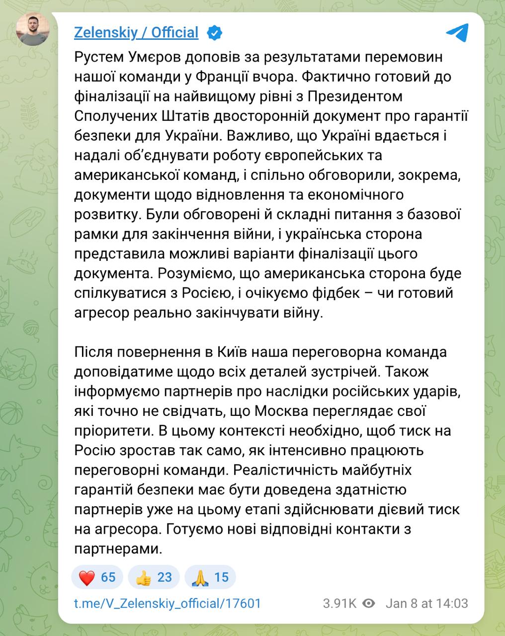 По его словам, секретарь СНБО Рустем Умеров доложил ему, что на переговорах во Франции делегации Украины и США обсуждали "сложные вопросы по базовой рамке для окончания войны, и украинская сторона представила возможные варианты финализации этого документа". Теперь ожидаются переговоры представителей США и РФ и реакция Москвы на подготовленные документы.