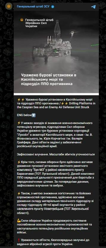 16:10 Генштаб ВСУ заявляет о поражении трех буровых установок "Лукойл" в Каспийском море.