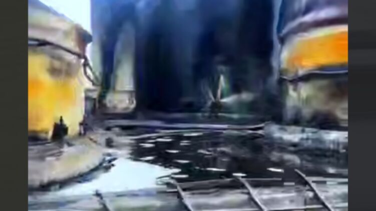 На видео стоянка с масловозами покртылась слоем продукта в несколько сантиметров. Можно заметить, что струи масла бьют из повреждённых осколками цистерен.