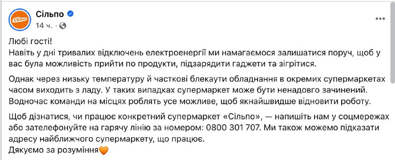 Ранее мы писали, что некоторые сети супермаркетов из-за длительных отключений света закрыли часть своих киевских магазинов.